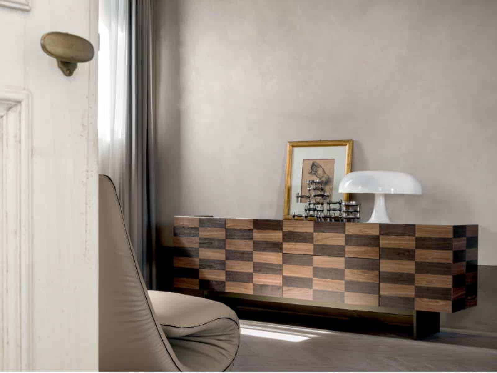 Una madia contenitore in legno, lavorata finemente con intarsio laser. La struttura di Colosseo è di noce canaletto, e viene snellita dalla moderna base in bronzo pietra. Disponibile in più versioni e misure, con due cassetti centrali ed ante laterali, o con tre o quattro ante.