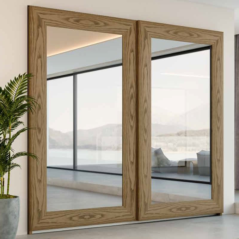 olmo e ha di serie n. 2 ripiani interni e n. 4 aste appendiabiti. I frontali sono composti da grandi specchi incorniciati