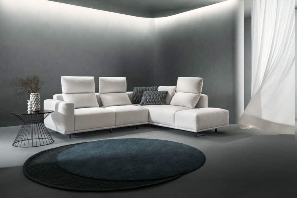 Elegante divano modulare bianco con cuscini decorativi in un moderno ambiente domestico.