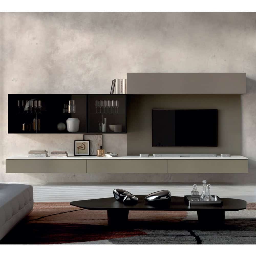 Elegante mobile soggiorno in stile moderno con colori neutri e finiture di alta qualità, perfetto per arredare con classe e funzionalità.