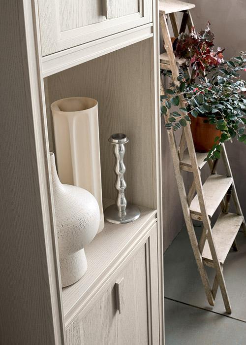 Le ante a vetro bronzato con decoro serigrafico si abbinano ai profili delle cornici, valorizzando la superficie di ogni parte del mobile da cui emergono le comode ed eleganti maniglie