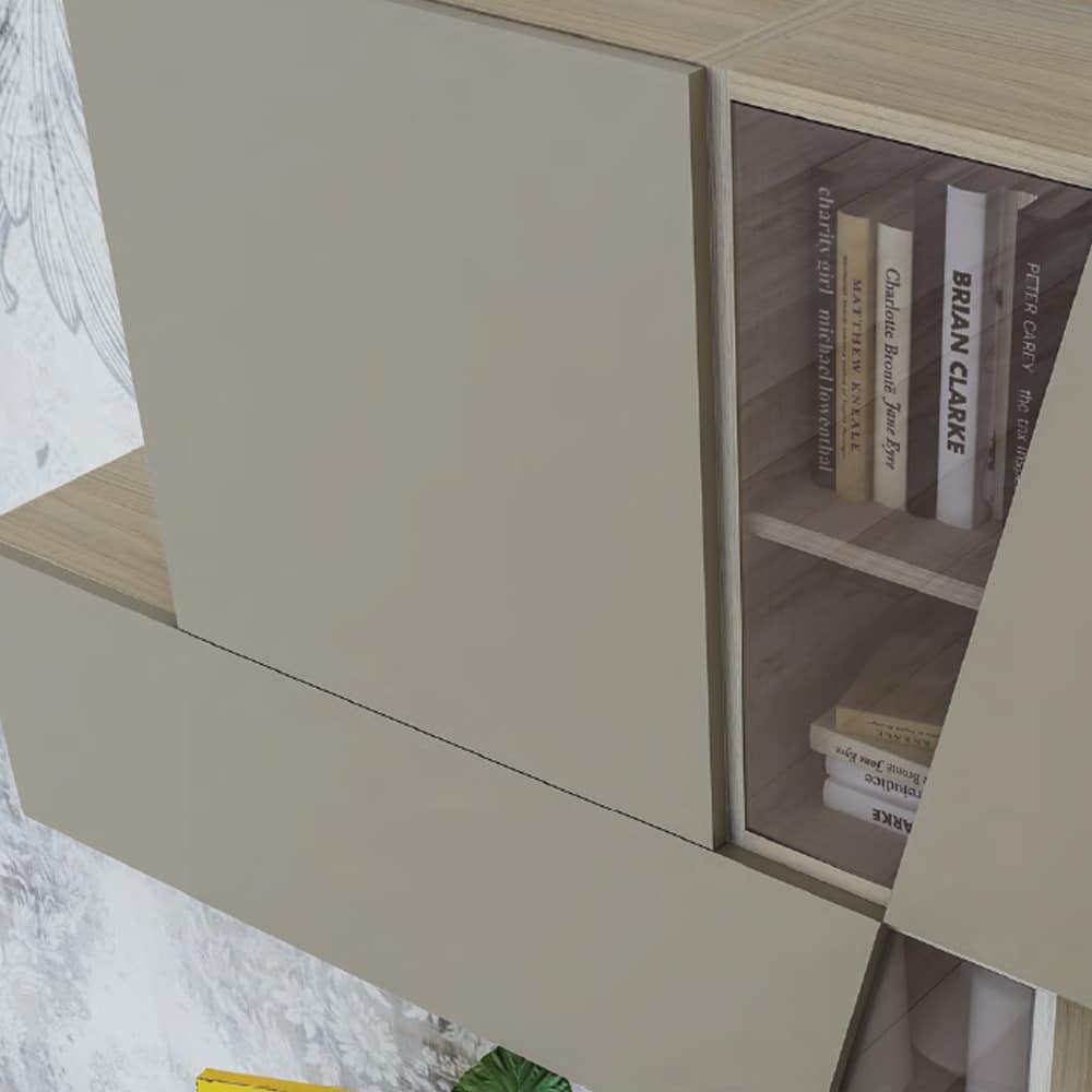 Elegante mobile soggiorno in stile moderno con colori neutri e finiture di alta qualità, perfetto per arredare con classe e funzionalità.