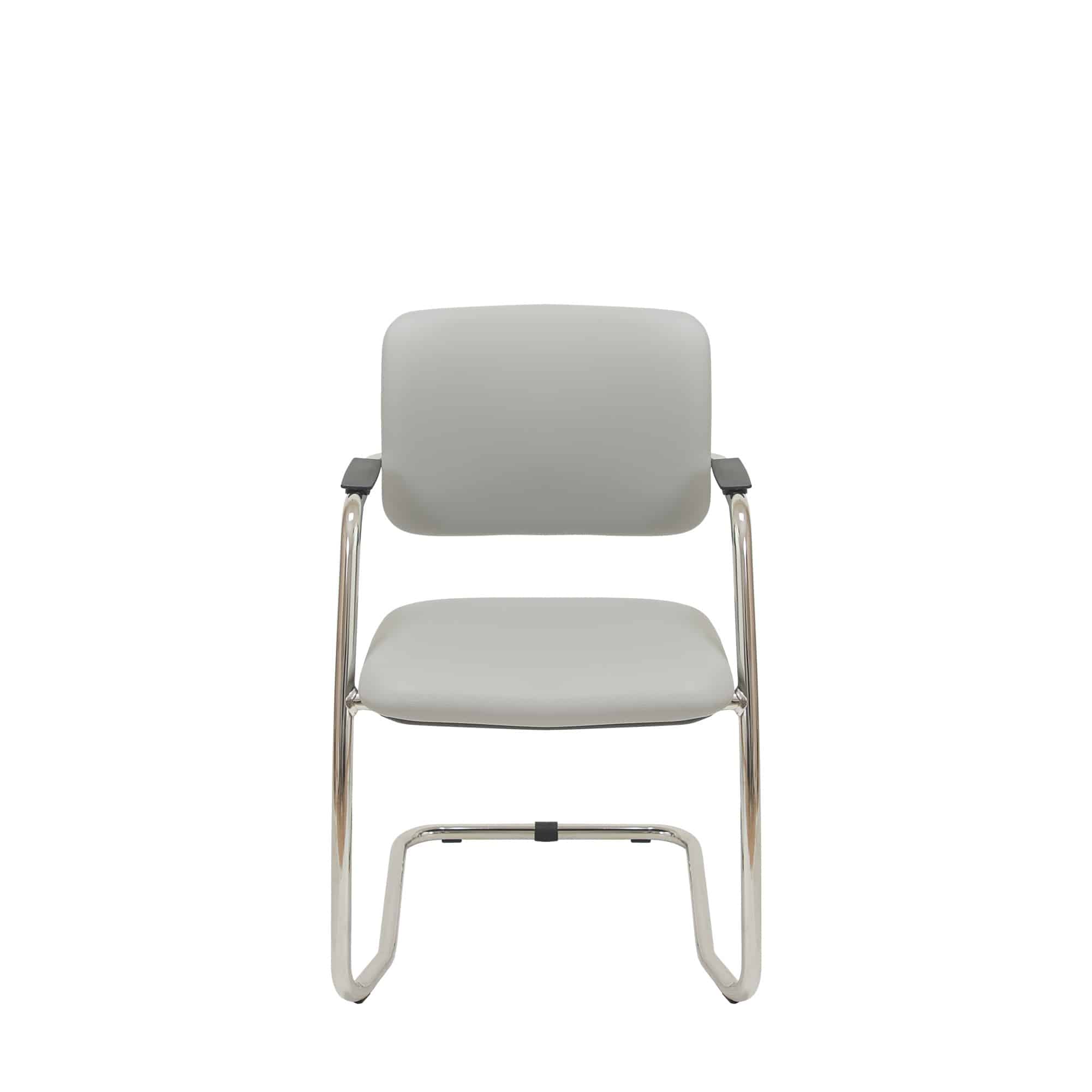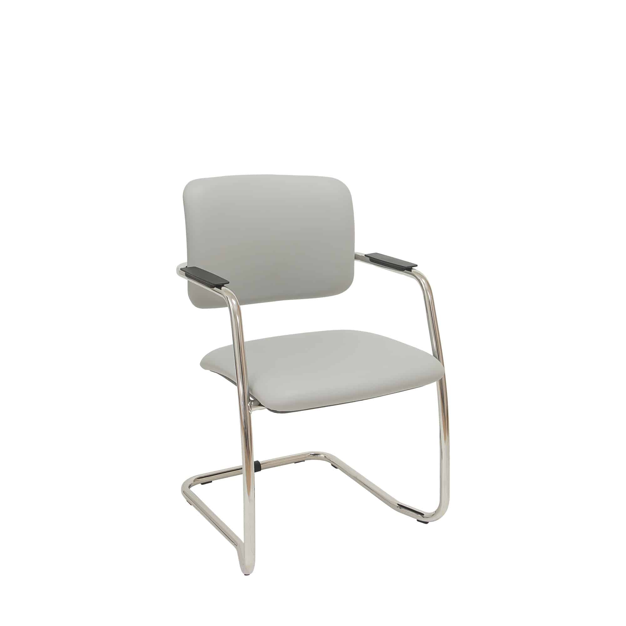 Poltrona visitatore con schienale basso o alto realizzata con telaio in tubo tondo in acciaio cromato diametro mm. 25, sedile e schienale in polipropilene colore nero, imbottitura in poliuretano espanso, carter esterno dello schienale e copri braccioli in polipropilene colore nero. Con schienale basso e alto imbottito.