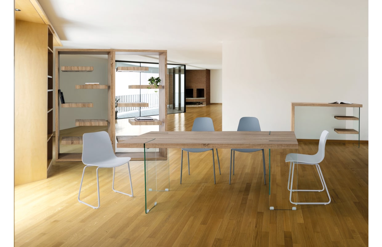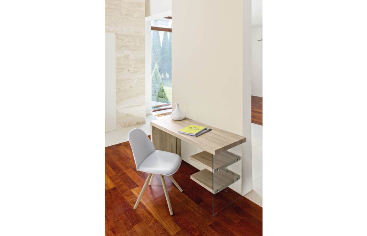 SCRIVANIA CON PIANO, MENSOLE E FIANCO SINISTRO IN MDF RIVESTITO CON CARTA MELAMINICA EFFETTO LEGNO. SCHIENA E FIANCO DX IN VETRO TEMPERATO SPESSORE 10MM. PORTATA MAX MENSOLE 2KG. DA ASSEMBLARE.