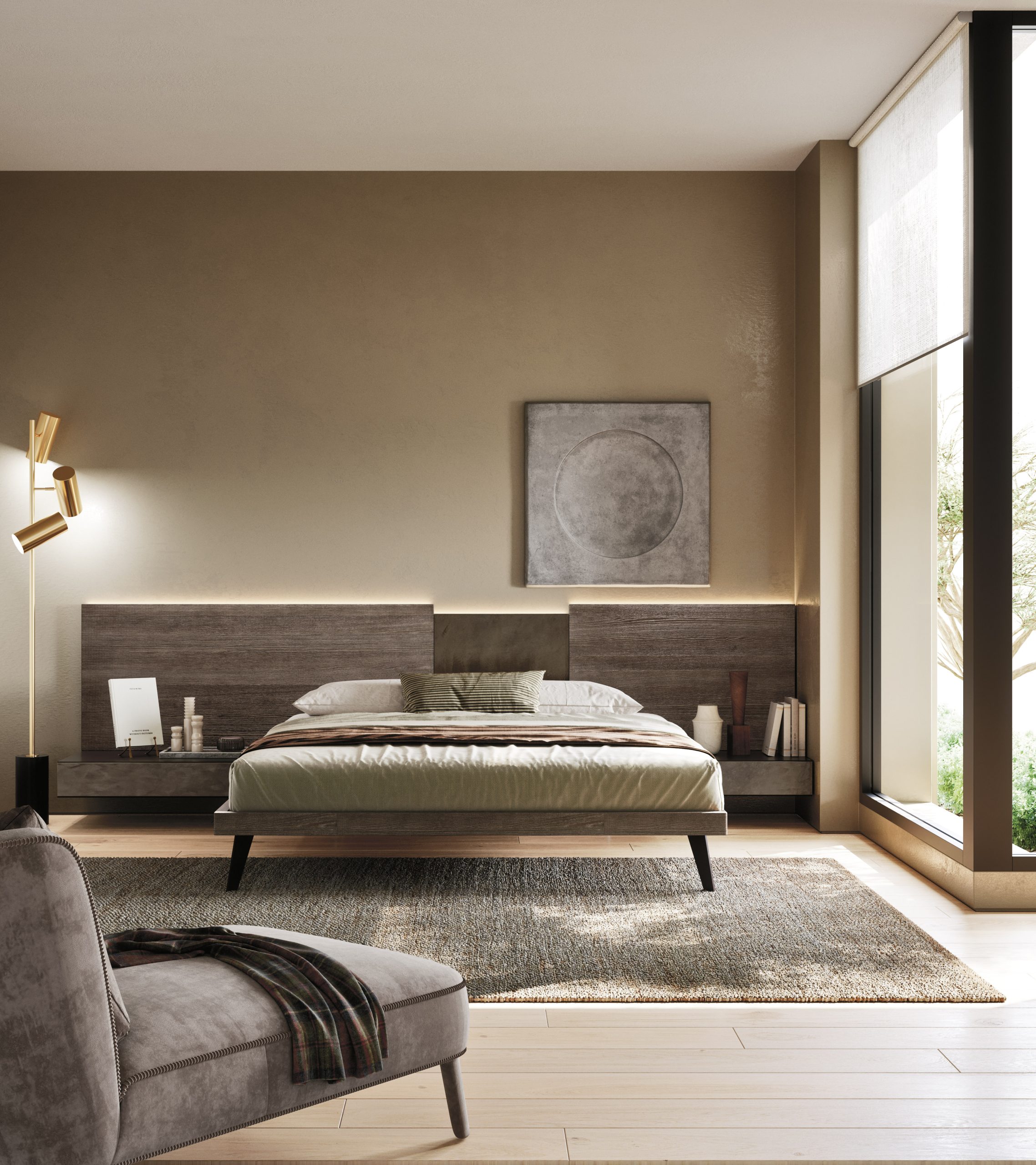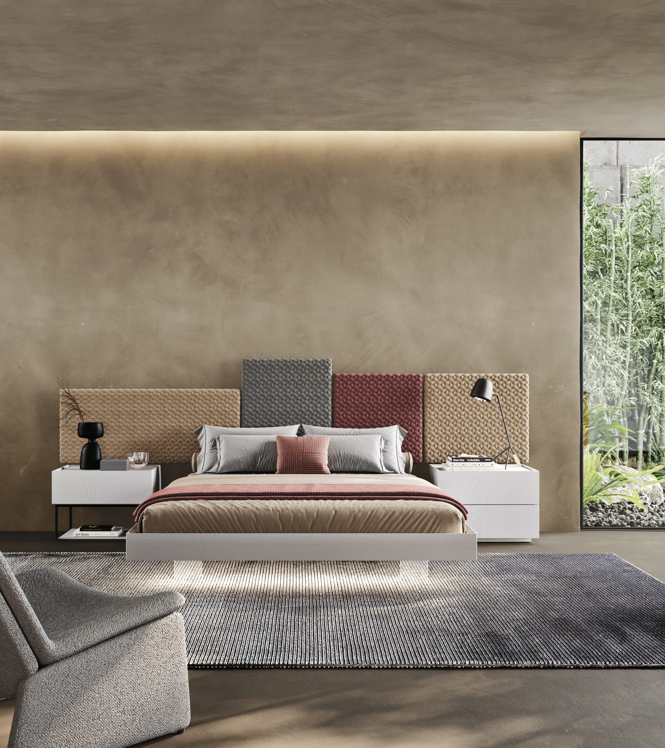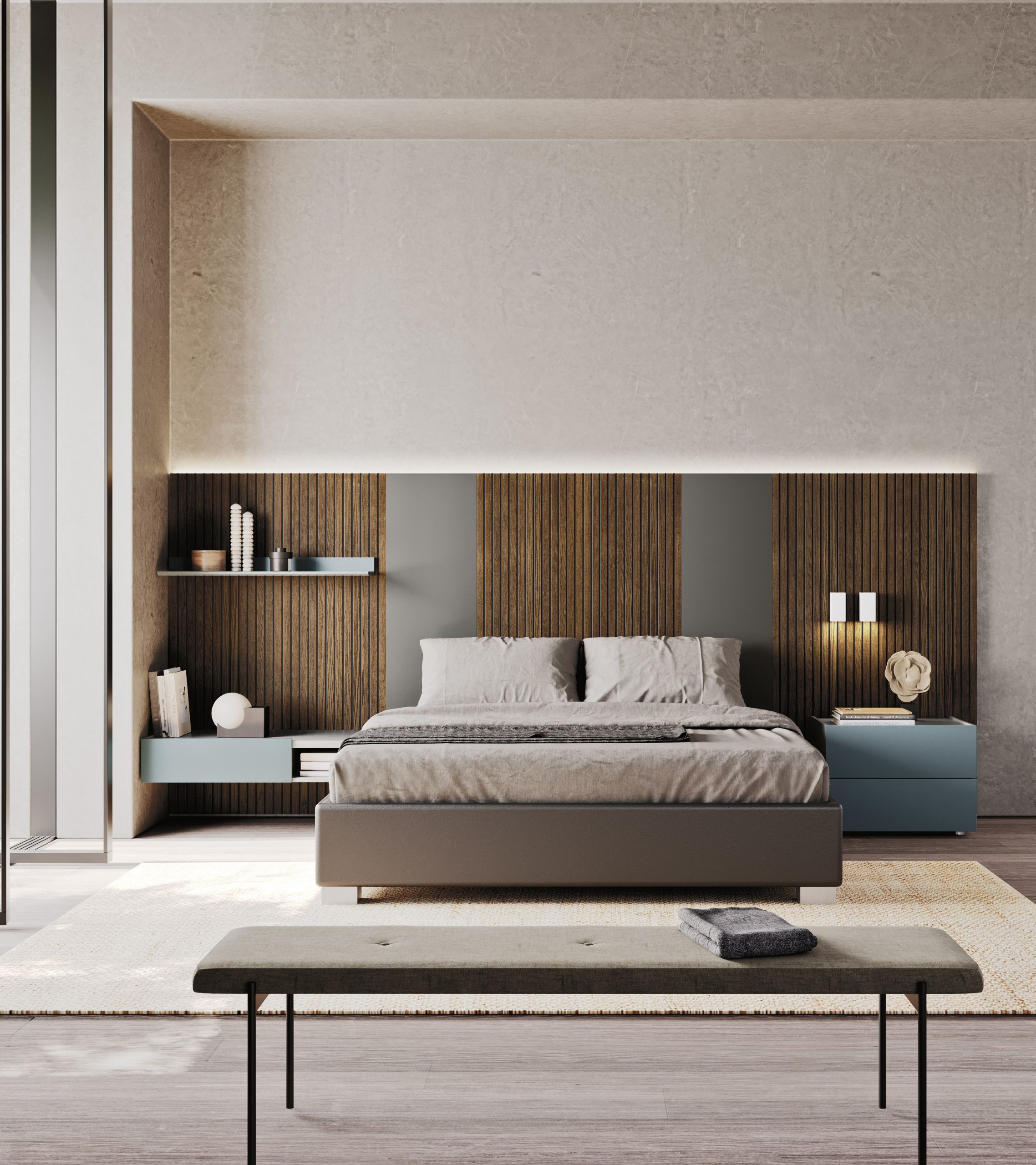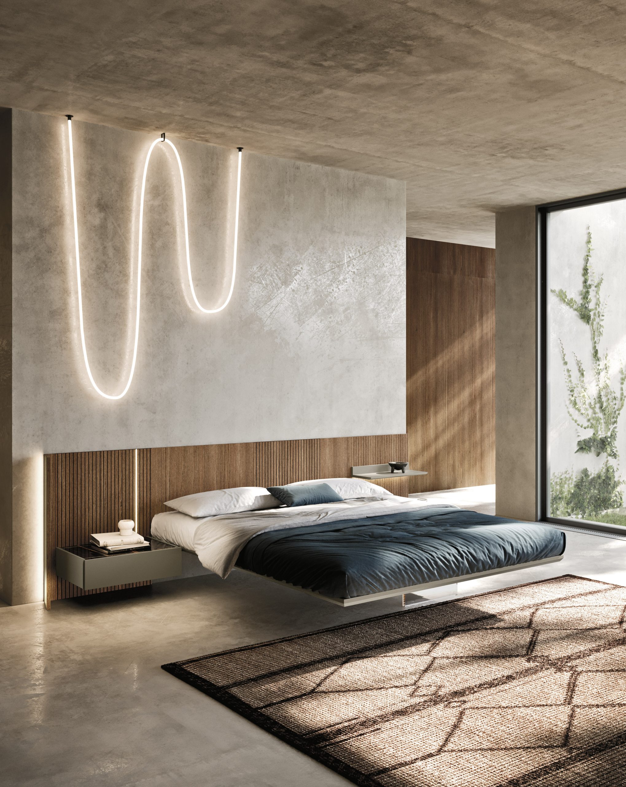 Le linee essenziali del letto sospeso si fondono con la parete retrostante in frassino multiriga, dando vita a un gioco visivo di grande eleganza.