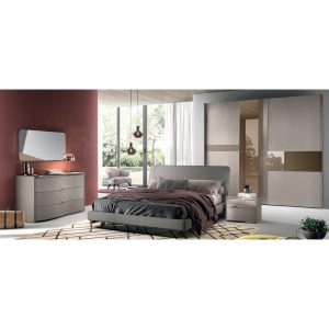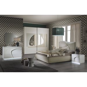 Elegante camera da letto moderna con mobili in legno chiaro e dettagli in bianco, atmosfera luminosa e accogliente, perfetta per residenze contemporanee di alta qualità.