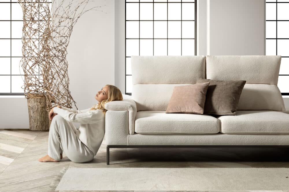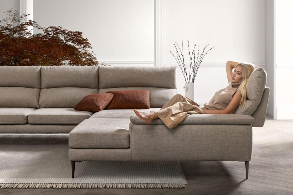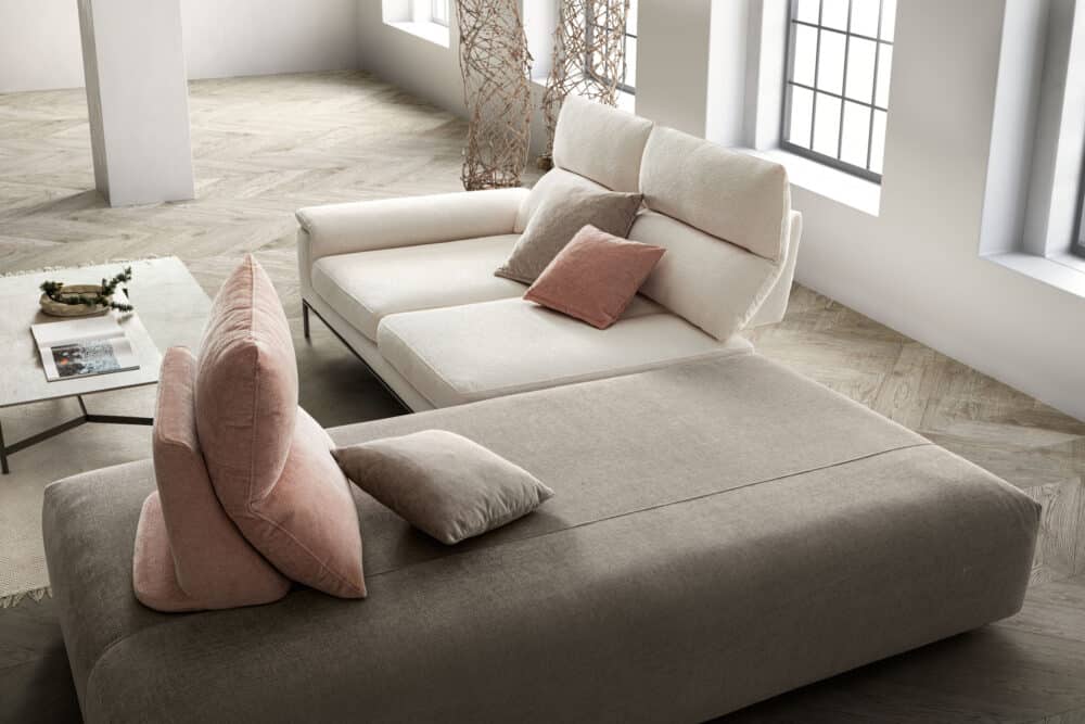 Divano caratterizzato da un design moderno e innovativo. L’ampia modularità disponibile e il sistema di sedute con schiene con meccanismo traslante,