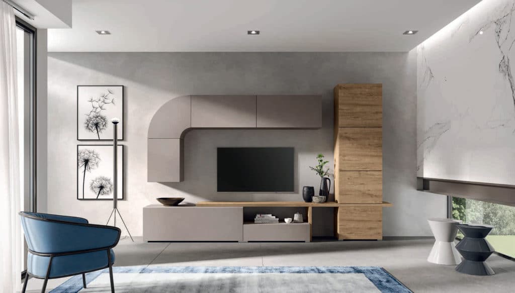 Elegante mobile soggiorno moderno con arredi in legno naturale e design minimalista, ideale per ambienti di casa raffinati e funzionali, perfetti per arredare il tuo living con stile.