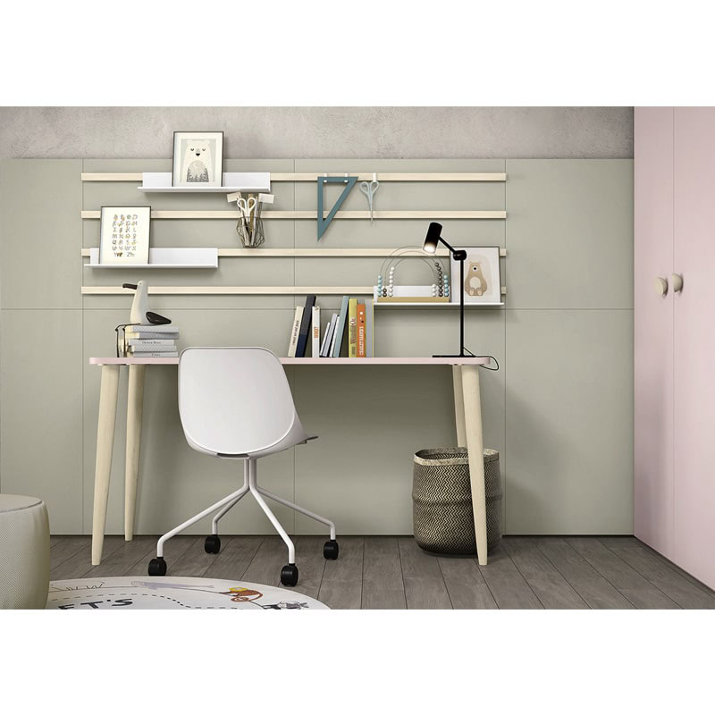Letto singolo in stile moderno con arredamento in legno chiaro, zona studio con scrivania e sedia ergonomica, decorazioni delicate e ambiente luminoso con vista sul verde.