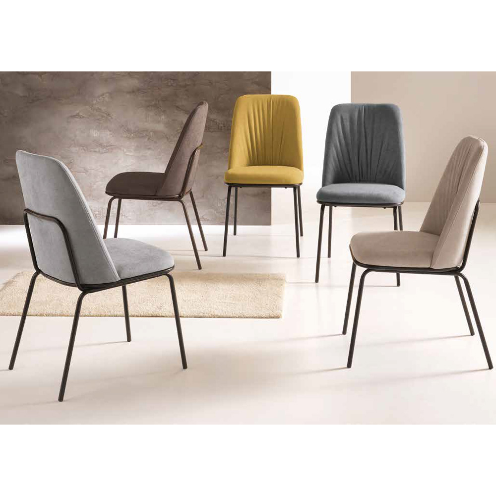 Sedia imbottita in tessuto con struttura in metallo verniciato. Disponibile in diversi