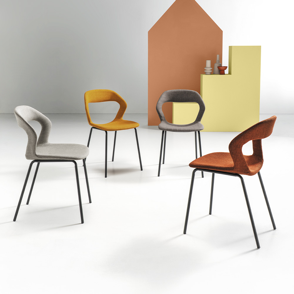 Sedia imbottita in tessuto con struttura in metallo. Disponibile in diversi colori.