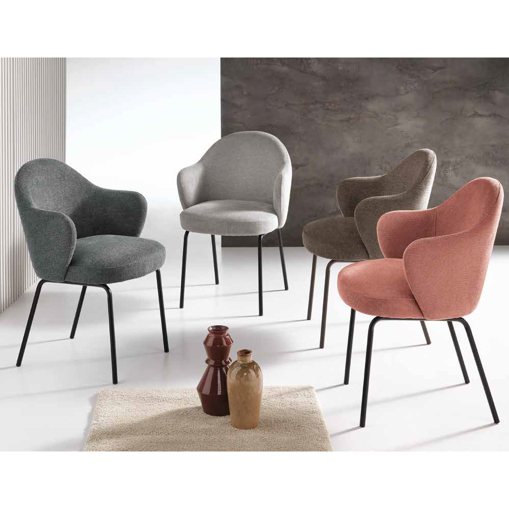 Sedia moderna in tessuto beige con gambe in metallo nero, arredi di design per soggiorno o ufficio.