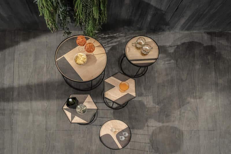Parete di tavoli da pranzo moderni con sedie ergonomiche, realizzati da Alpe Arredi, perfetti per ambienti di lusso e design ricercato.