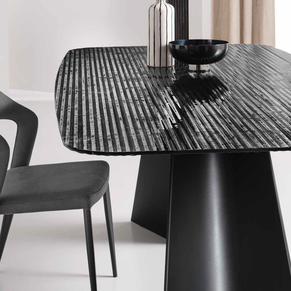 Tavolo fisso con base in metallo verniciato nero o bronzo.