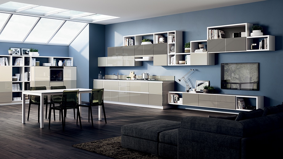 Diversi elementi coordinati tra di loro fanno si che l’ambiente sia in totale armonia. Questa versione di DeLinea di Scavolini, è il perfetto esempio di unico ambiente coordinato. La soluzione con isola infatti integra al meglio la zona cucina, con fornelli e mensole, con la zona giorno creando un tutt’uno.